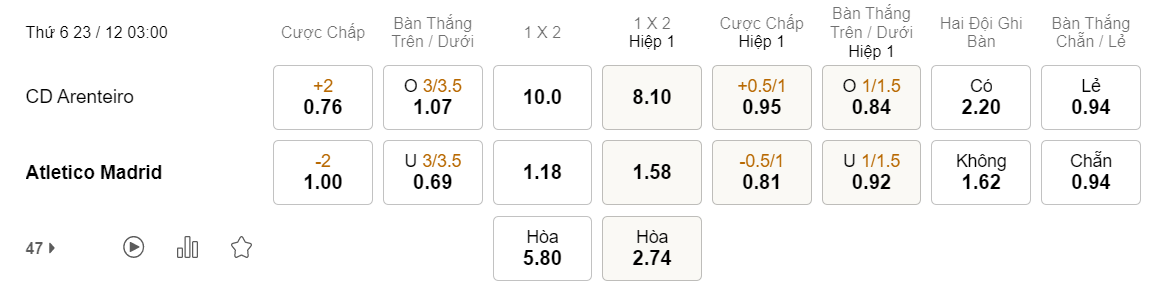 Soi kèo châu Á Arenteiro vs Atletico Madrid: 0.76*2*1.00