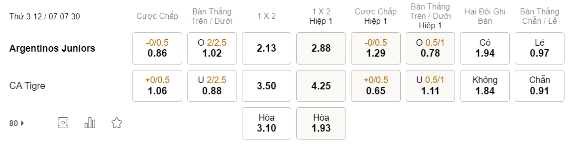 Soi kèo châu Á Argentinos Juniors vs Tigre: 0.86*0/0.5*0.88