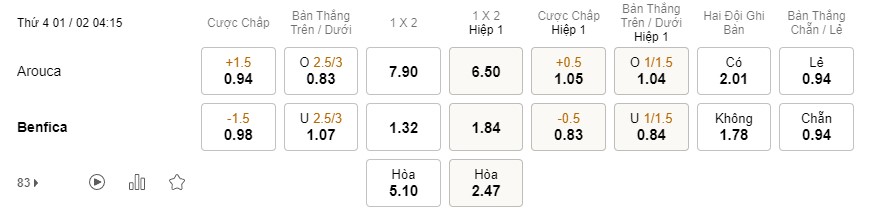 Soi kèo hiệp 1 Arouca vs Benfica: 1.05*0.5*0.83