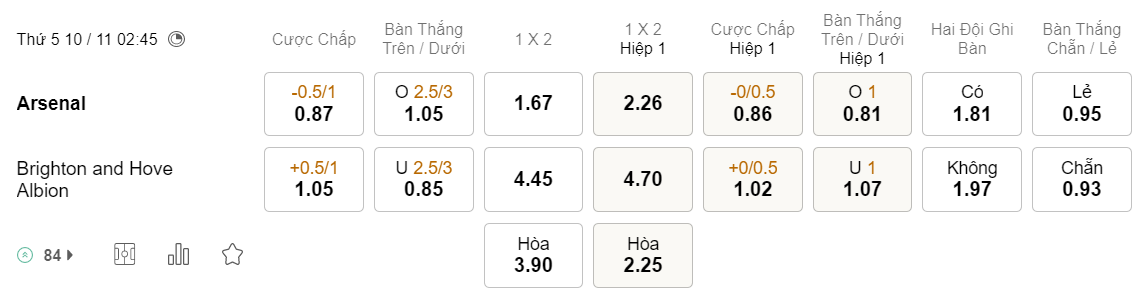 Soi kèo hiệp 1 Arsenal vs Brighton: 0.86*0/0.5*1.02