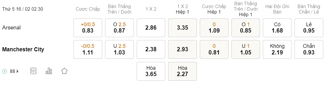Tỉ lệ kèo Arsenal vs Man City