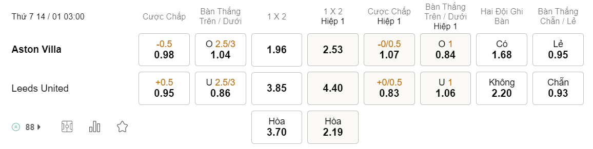 Soi kèo hiệp 1 Aston Villa vs Leeds: 1.07*0/0.5*0.83