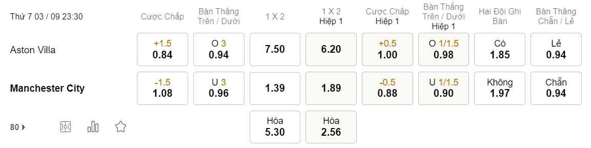 Soi kèo châu Á Aston Villa vs Man City: 0.84*1.5*1.08