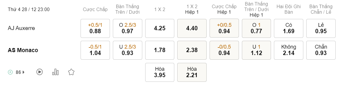 Soi kèo châu Á Auxerre vs Monaco: 0.88*0.5/1*1.04