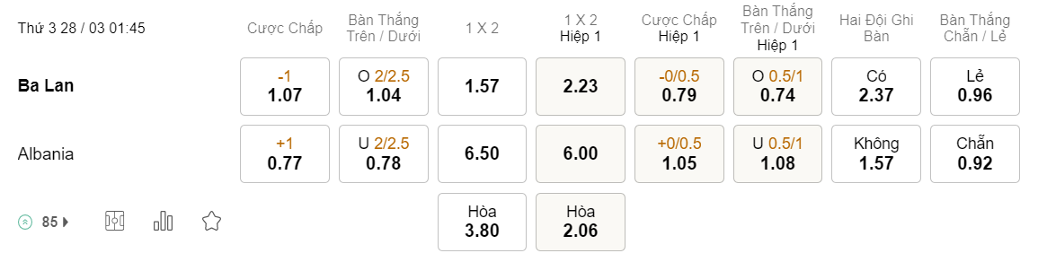 Soi kèo hiệp 1 Ba Lan vs Albania: 0.79*0/0.5*1.05