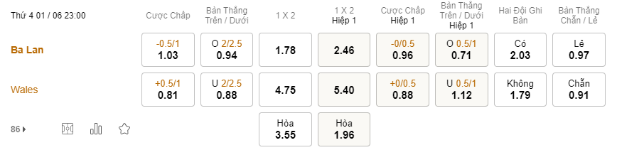 Tỉ lệ kèo Ba Lan vs Wales