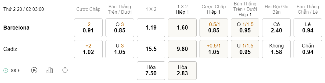 Tỉ lệ kèo Barcelona vs Cadiz