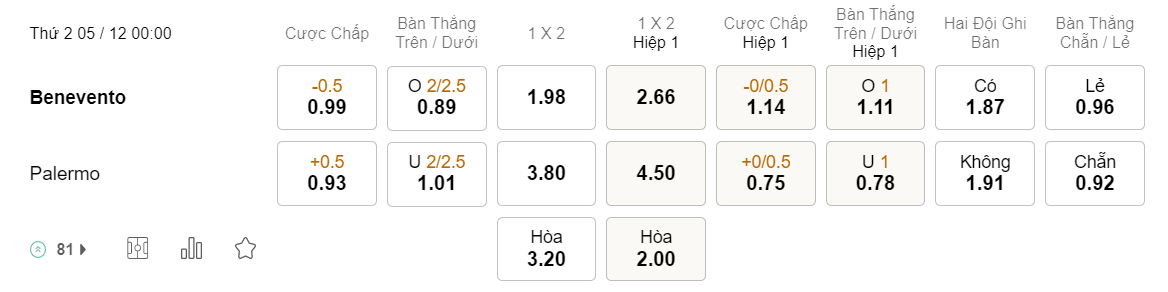 Tỉ lệ kèo Benevento vs Palermo