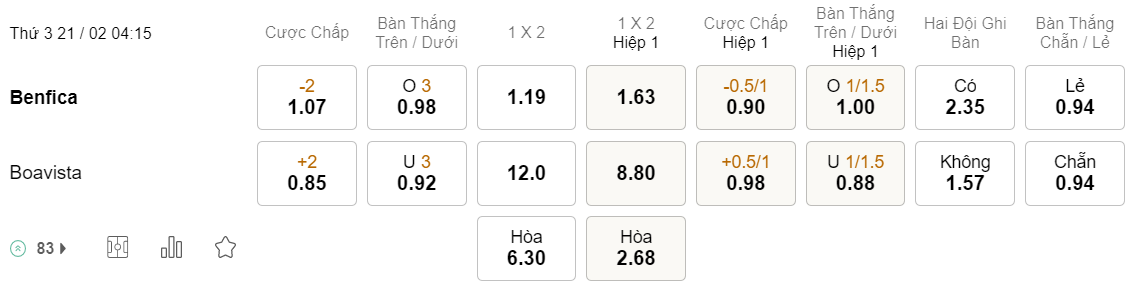 Soi kèo châu Á Benfica vs Boavista: 1.07*2*0.85
