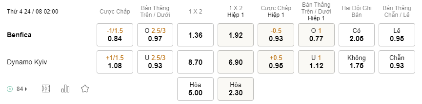 Soi kèo châu Á Benfica vs Dynamo Kiev: 0.84*1/1.5*1.08