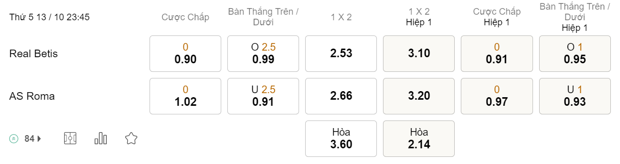 Tỉ lệ kèo Betis vs Roma