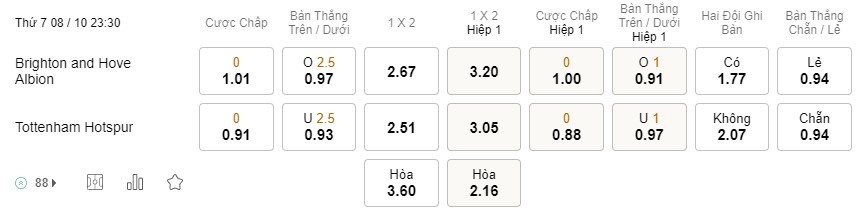 Soi kèo hiệp 1 Brighton vs Tottenham: 1.00*0*0.88