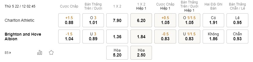 Tỉ lệ kèo Charlton vs Brighton