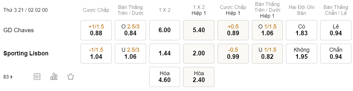 Tỉ lệ kèo Chaves vs Sporting Lisbon
