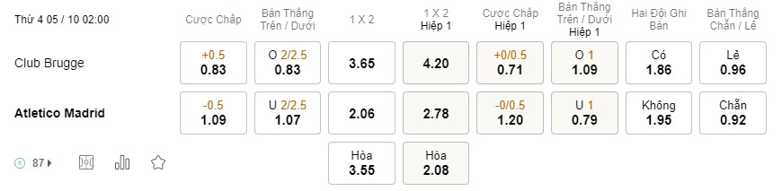 Soi kèo hiệp 1 Club Brugge vs Atletico Madrid: 0.71*0/0.5*1.20