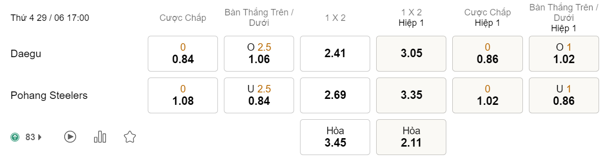 Soi kèo tài xỉu Daegu vs Pohang Steelers: 1.06*2.5*0.84