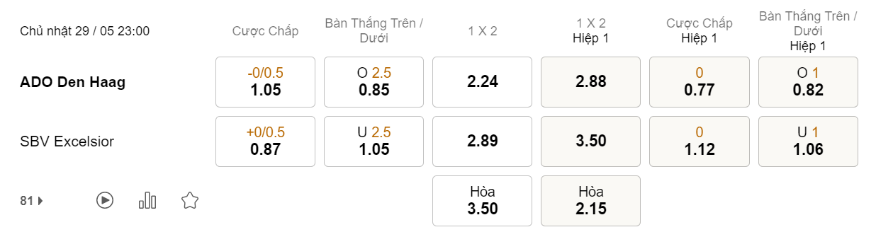 Soi kèo tài xỉu Den Haag vs Excelsior: 0.85*2.5*1.05