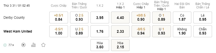 Soi kèo châu Á Derby County vs West Ham: 0.84*0.5/1*1.00