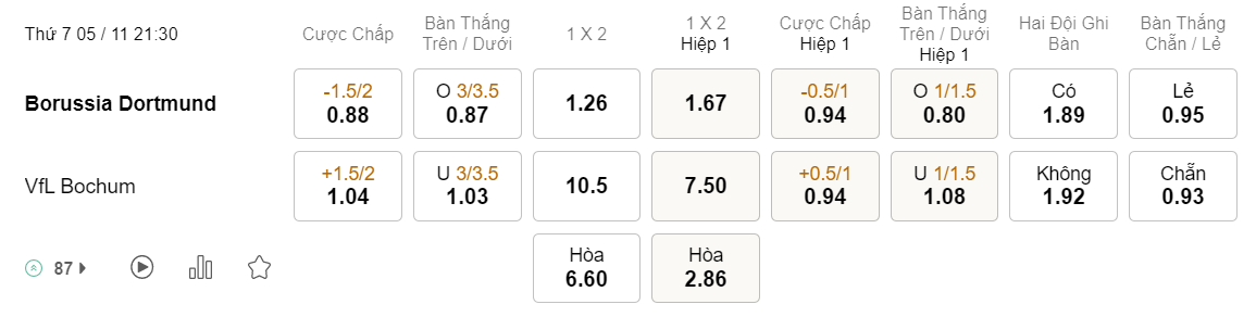 Soi kèo hiệp 1 Dortmund vs Bochum: 0.94*0.5/1*0.94
