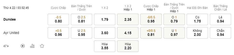 Soi kèo tài xỉu Dundee vs Ayr United: 0.81*2.5*0.95