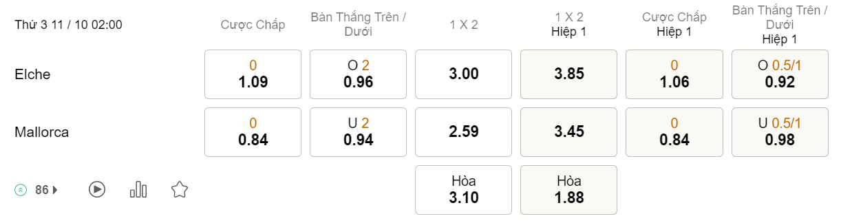 Soi kèo hiệp 1 Elche vs Mallorca: 1.06*0*0.84