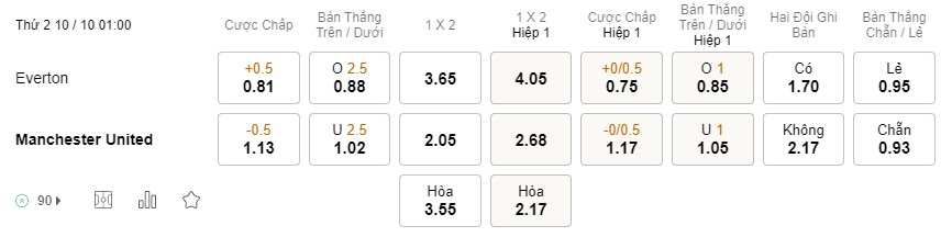 Tỉ lệ kèo Everton vs MU
