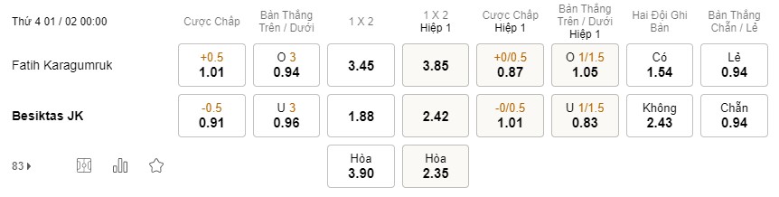 Tỉ lệ kèo Fatih Karagumruk vs Besiktas