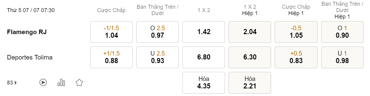 Soi kèo hiệp 1 Flamengo vs Deportes Tolima: 1.05*0.5*0.83