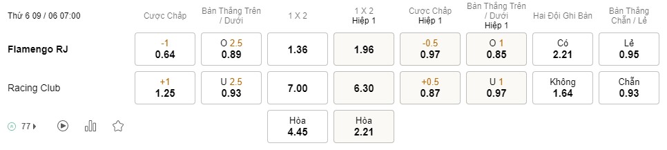Trong khi đó, Racing Club hòa 1, thắng 2 nhưng cũng để thua tới 2 trong 5 lần ra sân gần nhất. Họ chỉ đang đứng vị trí thứ 17 trên BXH giải VĐQG Argentina. Vì vậy các chuyên gia nhận định, nếu chơi đúng với phong độ, Flamengo khả năng cao sẽ có chiến thắng cuối cùng.