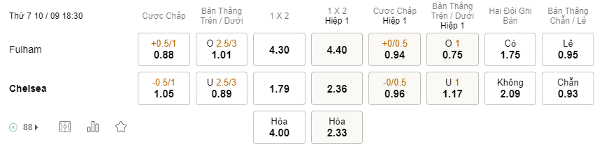 Tỉ lệ kèo Fulham vs Chelsea