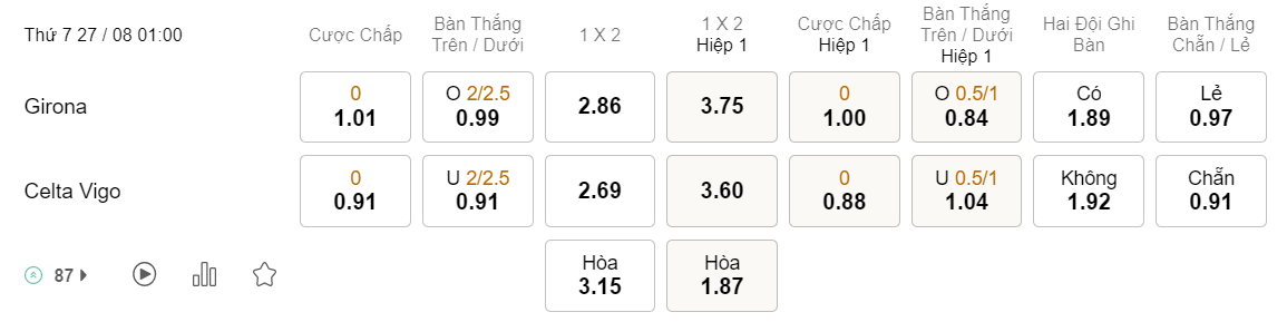 Soi kèo tài xỉu Girona vs Celta Vigo: 0.99*2/2.5*0.91