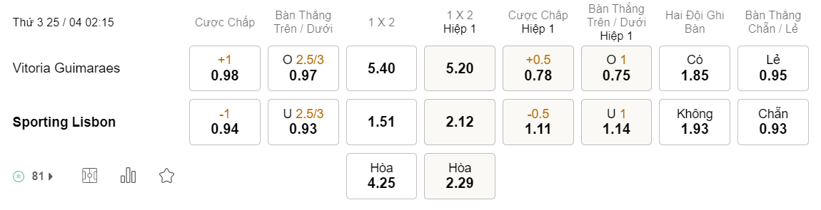 Tỉ lệ kèo Guimaraes vs Sporting Lisbon