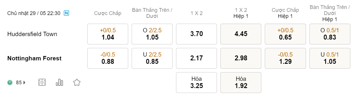 Soi kèo hiệp 1 Huddersfield vs Nottingham: 0.65*0/0.5*1.29