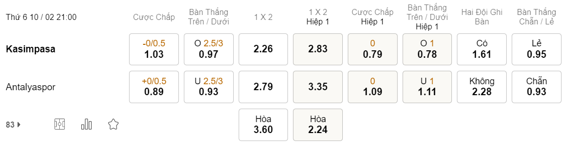 Tỉ lệ kèo Kasimpasa vs Antalyaspor