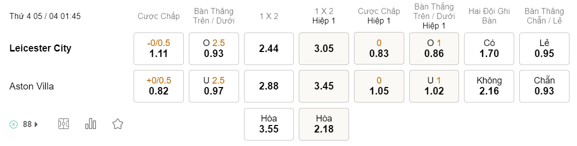 Tỉ lệ kèo Leicester vs Aston Villa