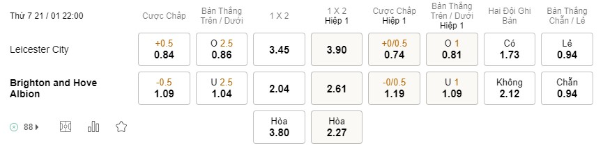 Soi kèo hiệp 1 Leicester vs Brighton: 0.74*0/0.5*1.19