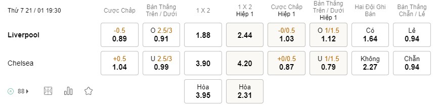 Soi kèo châu Á Liverpool vs Chelsea: 0.89*0.5*1.04