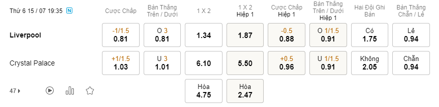 Soi kèo châu Á Liverpool vs Crystal Palace: 0.81*1/1.5*1.03
