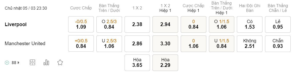 Tỉ lệ kèo Liverpool vs MU