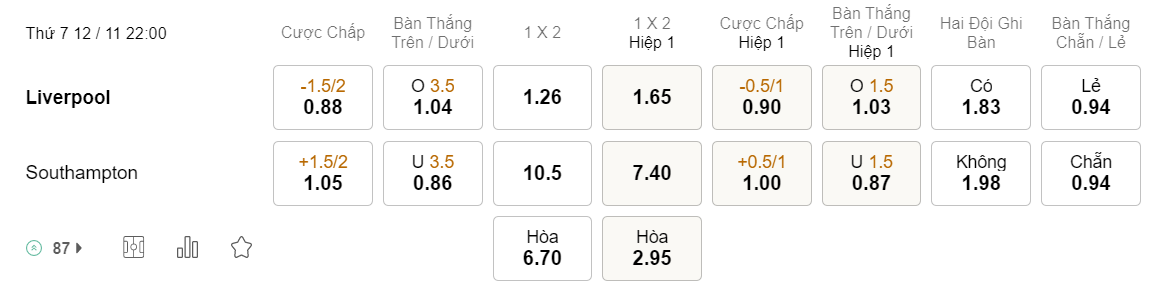 Tỉ lệ kèo Liverpool vs Southampton