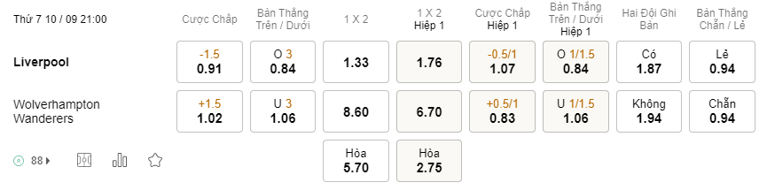 Soi kèo châu Á Liverpool vs Wolves: 0.91*1.5*1.02