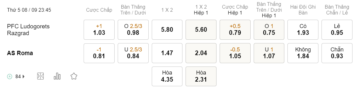 Soi kèo hiệp 1 Ludogorets vs Roma: 0.79*0.5*1.05