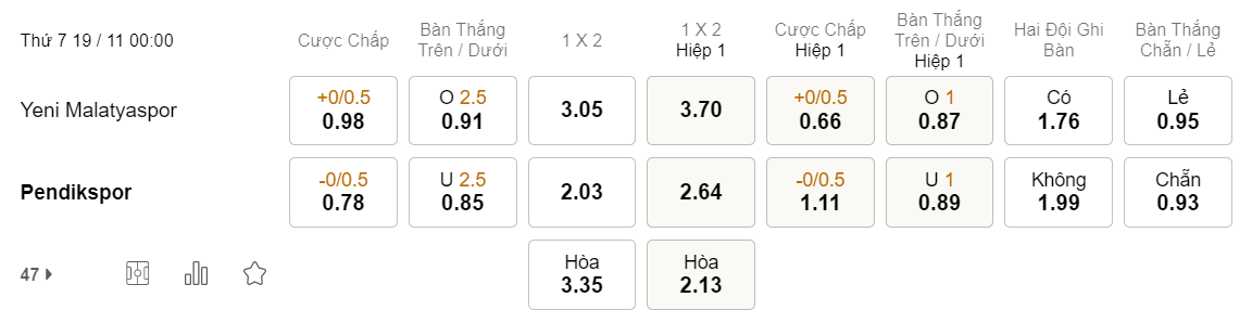 Soi kèo hiệp 1 Malatyaspor vs Pendikspor: 0.66*0/0.5*1.11