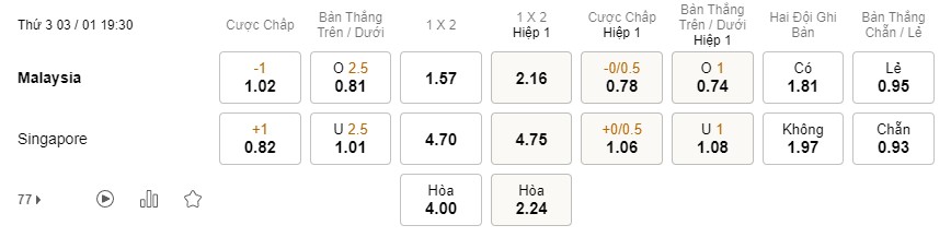 Soi kèo hiệp 1 Malaysia vs Singapore: 0.78*0/0.5*1.06