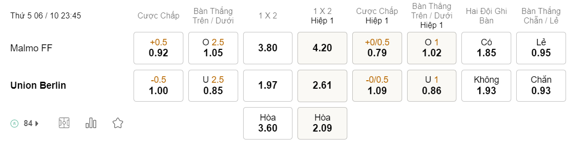 Soi kèo hiệp 1 Malmo vs Union Berlin: 0.79*0/0.5*1.09