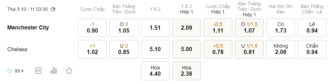 Soi kèo châu Á Man City vs Chelsea: 0.90*1*1.02