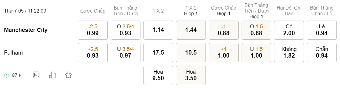 Tỉ lệ kèo Man City vs Fulham