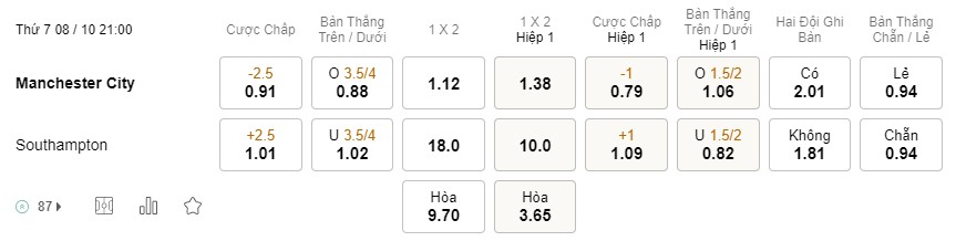 Soi kèo châu Á Man City vs Southampton: 0.91*2.5*1.01