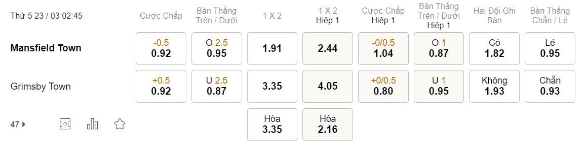 Tỉ lệ kèo Mansfield vs Grimsby