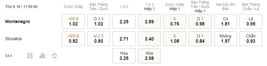 Soi kèo châu Á Montenergo vs Slovakia: 1.02*0/0.5*0.82